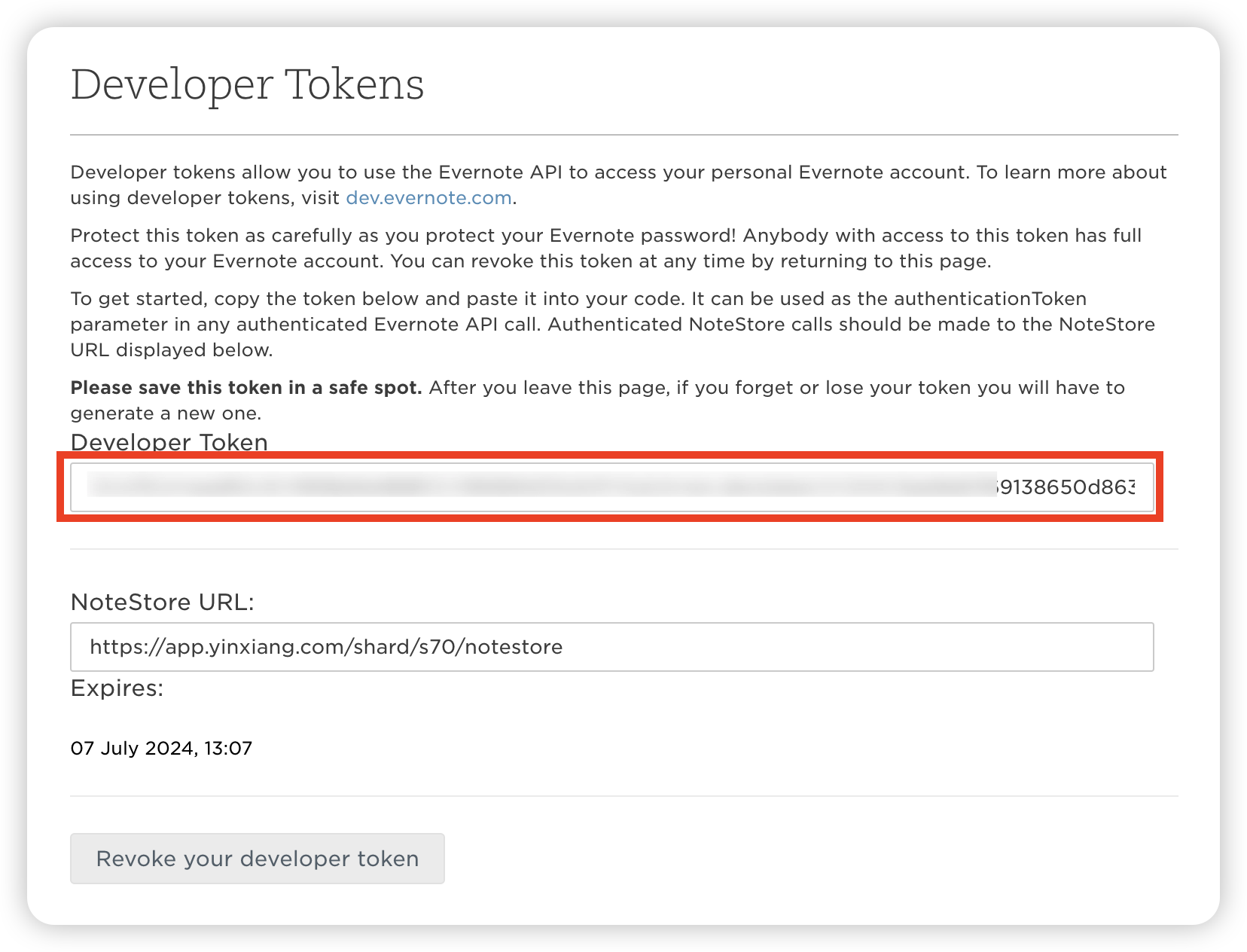 - 最下面有一个“Revoke your developer token”的中文意思是“撤销之前的token”,你撤销之后,可以再点击“Create a developer token”重新创建token。