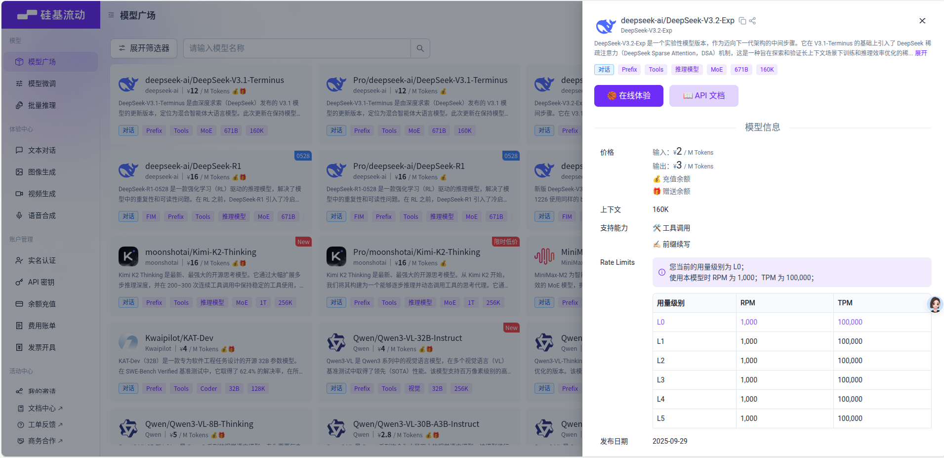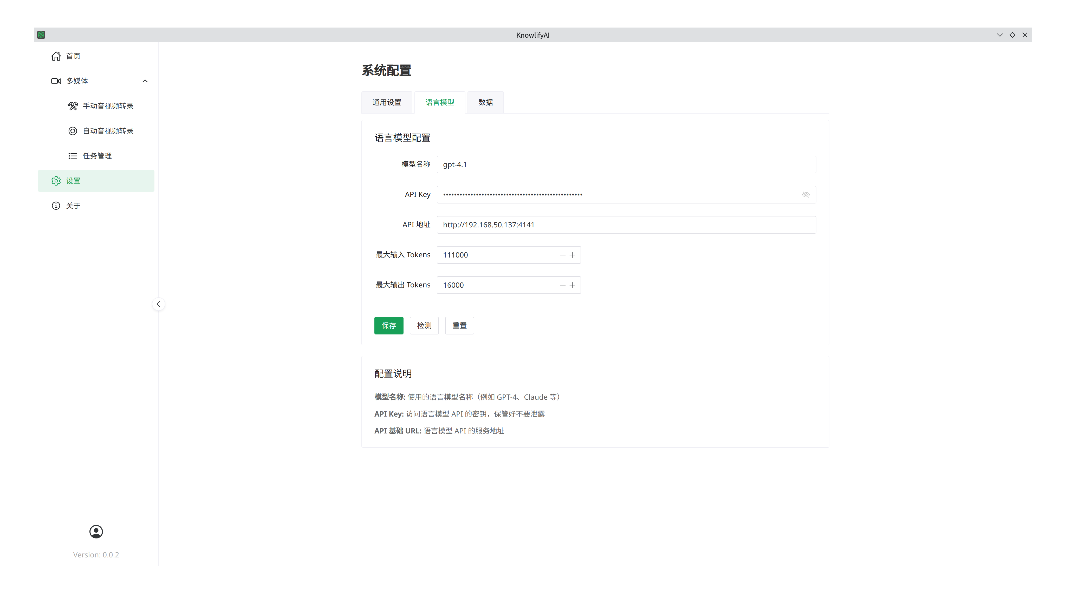 前面提到过有些功能是需要依赖于“大语言模型(简称LLM)”的,这里就是配置LLM的位置,我们以硅基流动的服务为例,点击API密钥,将密钥复制过来填入到“API Key”里面,“API 地址”填写为 “https://api.siliconflow.cn” ,“模型名称”则是从硅基流动的模型广场里找到的模型的名称,比如 “ deepseek-ai/DeepSeek-V3.2-Exp ” ,点击“保存”后就可以在转录的时候自动发挥作用了(保存后点击“检测”可以检测模型是否可用)。如果没有设置LLM参数,那么软件执行的时候将会自动跳过需要LLM的步骤。