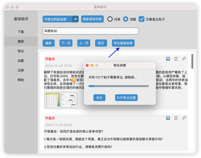 - 搜索模块中.该功能可以将按照关键词搜索出来的帖子批量导出,"话题" 类型和 "问答" 类型的帖子均可以.